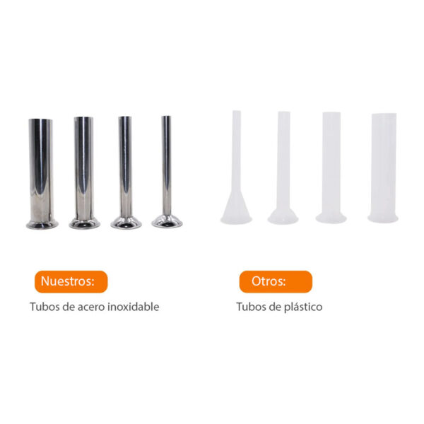 La embutidora consiste en un cilindro o tolva donde se coloca la mezcla de carne y especias que se utilizará para hacer las salchichas, permitiendo rellenar de manera uniforme y rápida diferentes tipos de embutidos o churros.